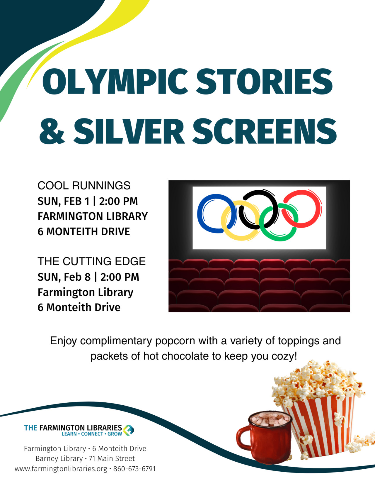 Get in the Olympic spirit with the classic The Cutting Edge movie from 1992. The movie is about a temperamental figure skater and an arrogant former hockey player that attempts to win the Winter Olympic Gold Medal as a figure skating pairs team starring D.B. Sweeney, Moira Kelly, and Roy Dotrice. It was rated PG and contains themes of romance, comedy, mild sexuality, binge drinking, and some roughhousing. There will be popcorn with toppings and packets of hot chocolate for patrons to enjoy.
