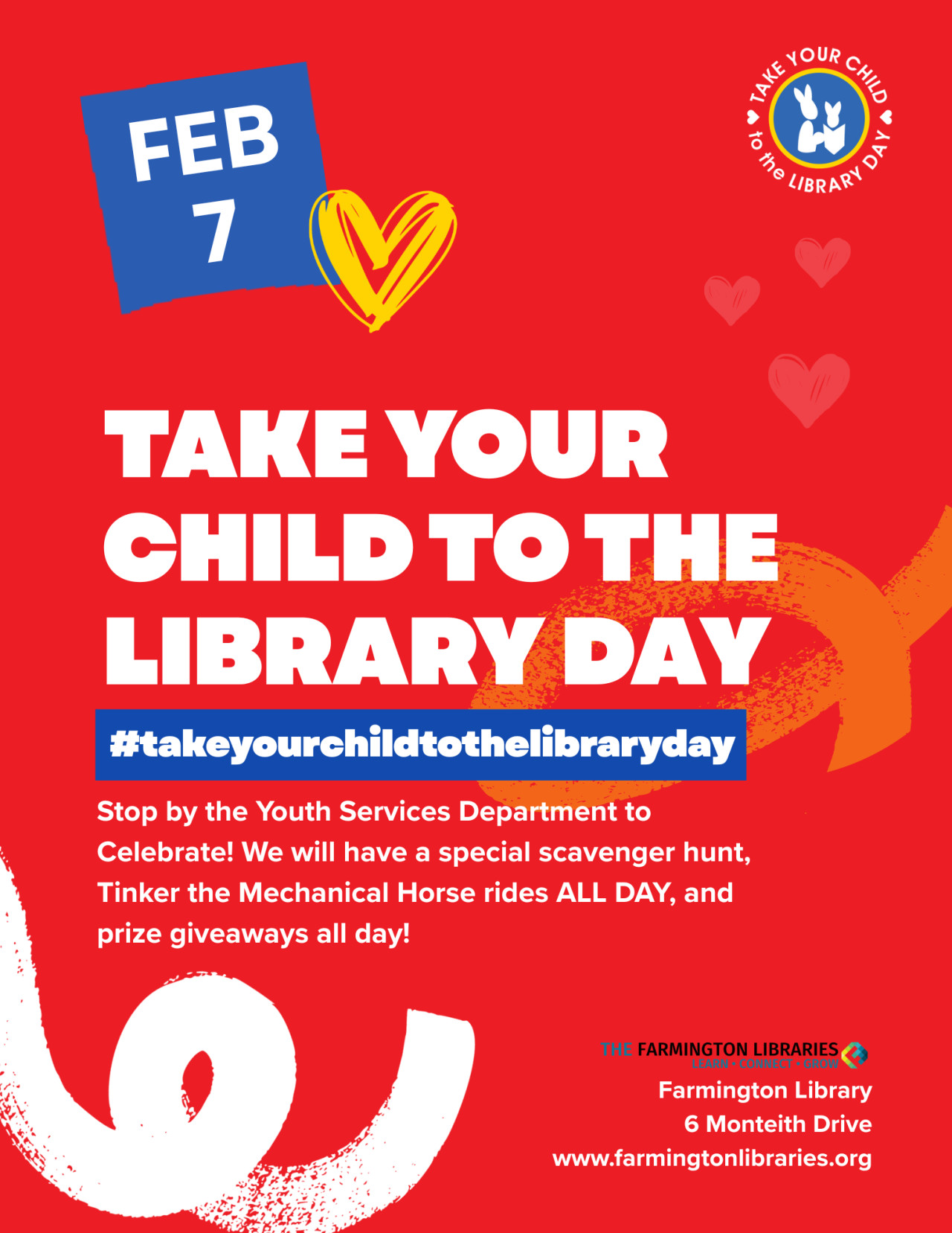 Celebrate 15 years of Take Your Child to the Library Day! Stop by the Youth Services Department to Celebrate! We will have a special scavenger hunt, Tinker the Mechanical Horse rides ALL DAY, and prize giveaways all day!